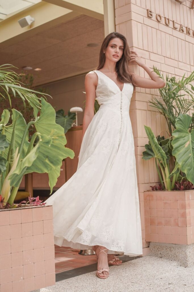 É justamente nesse contexto que vestidos mais minimalistas ganham espaço, não pela falta de detalhes, mas pela sofisticação do essencial.